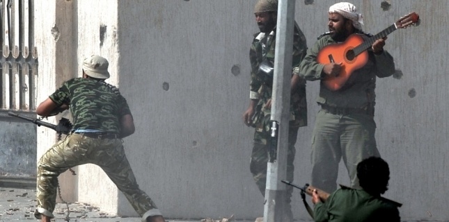 Que joue-t-il ? C’est Aldo, dans Le Rivage des Syrtes, attendant l’ennemi une guitare à la main. Il fait des solos, il chante aussi, selon le photographe à l’origine de ce cliché. Il faut retrouver ce Libyen pour qui la six-cordes aurait manifestement plus de portée que le six-coups, avant qu’il ne soit trop tard.